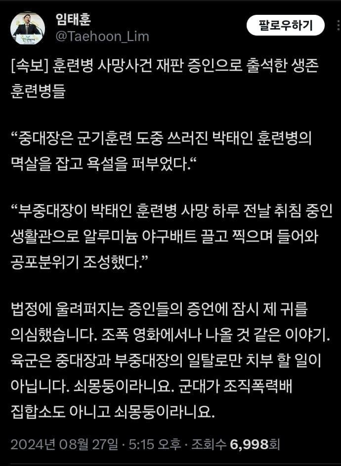 육군 12사단 신병교육대에서 훈련병이 사망한 후에도 가혹행위를 지시한 간부들이 농담을 주고받으며 웃고 떠들었다는 증언이 나왔다. 춘천지법 형사2부(김성래 부장판사)는 지난 13일 학대치사