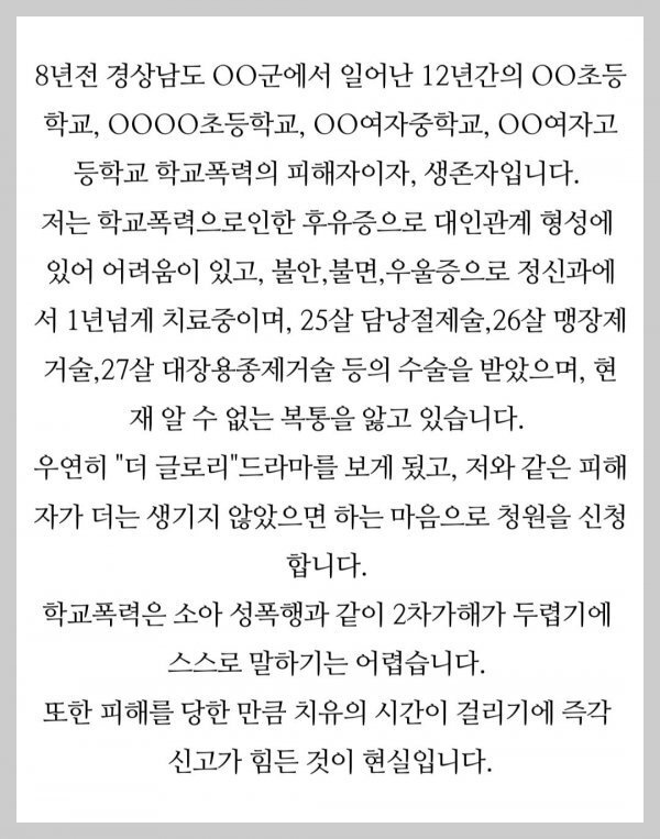 위 이력에서도 알 수 있듯이 김은숙 작가는 엄청난 성공을 했고, 국민들에게 큰 영향을 주었다. 즉, 기득권으로 들어간 분이시다. 그런 그가 더글로리를 통해 대한민국의 민낯을 세계에 알렸다.
